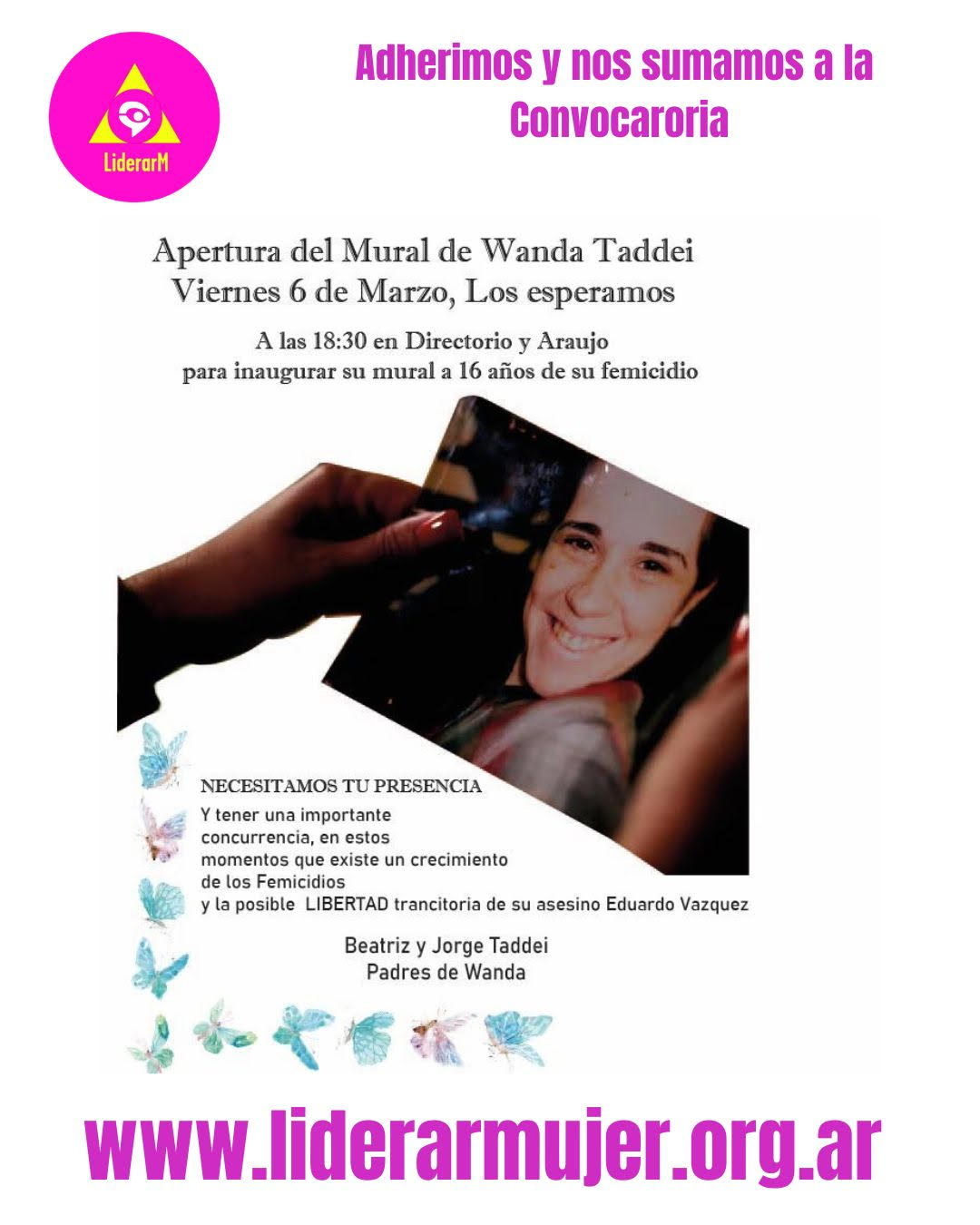 Desde Liderar Mujer y otras asociaciones civiles, queremos invitar a adherir a la Apertura del mural y también solicitar envíen una carta de adhesión, como apoyo al pedido de la flia. Taddei, por la alarma generada.