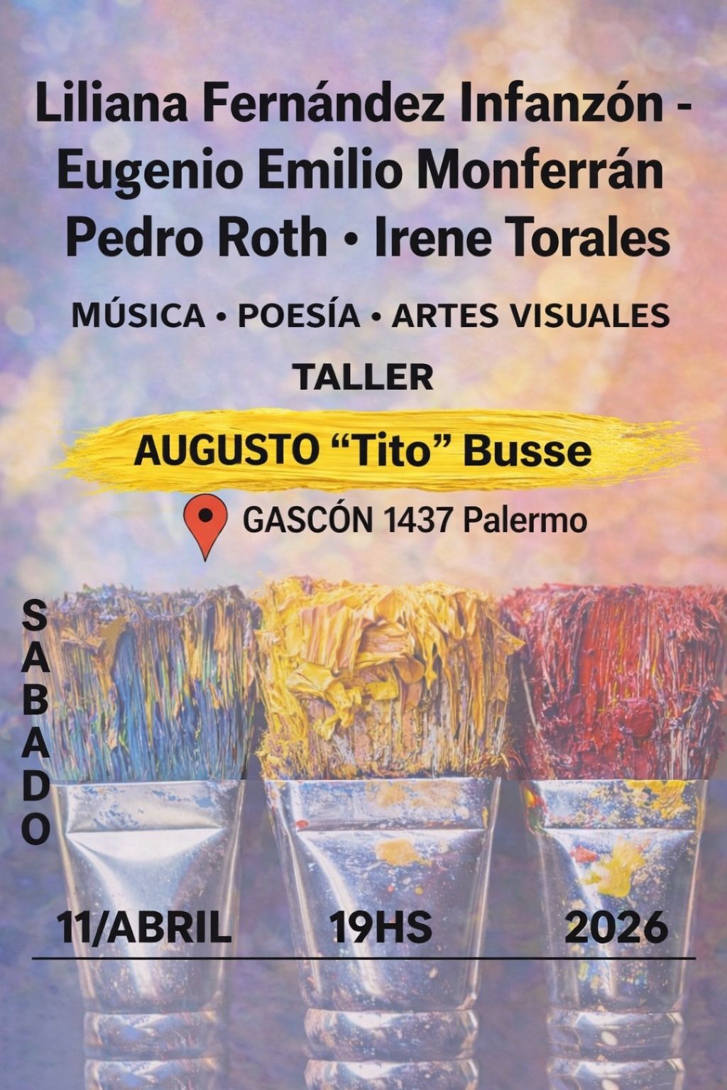 El próximo sábado 11 de abril a las 19hs., se realizará Taller Augusto «Tito» Busse, un espectáculo que conjuga las artes visuales, la poesía y la música en un homenaje al artista plástico santafesino en El Blanco -Centro de Experimentaciones Artísticas-, ubicado en Gascón 1437, CABA. En el mismo, se expondrán obras de Liliana Infanzón, Eugenio Emilio Monferrán, Pedro Roth e Irene Torales.
